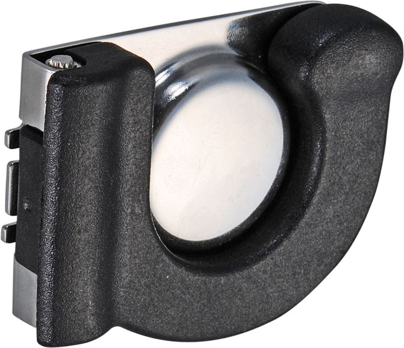 Stabiler Klapphalter aus schwarzem Kunststoff mit Federrastung, Grundplatte Edelstahl.