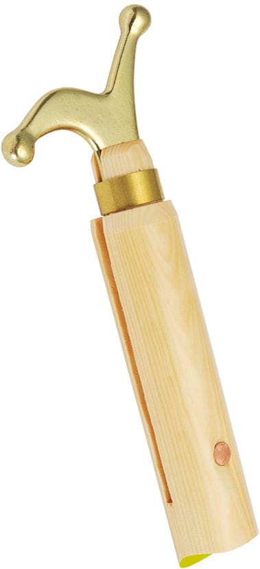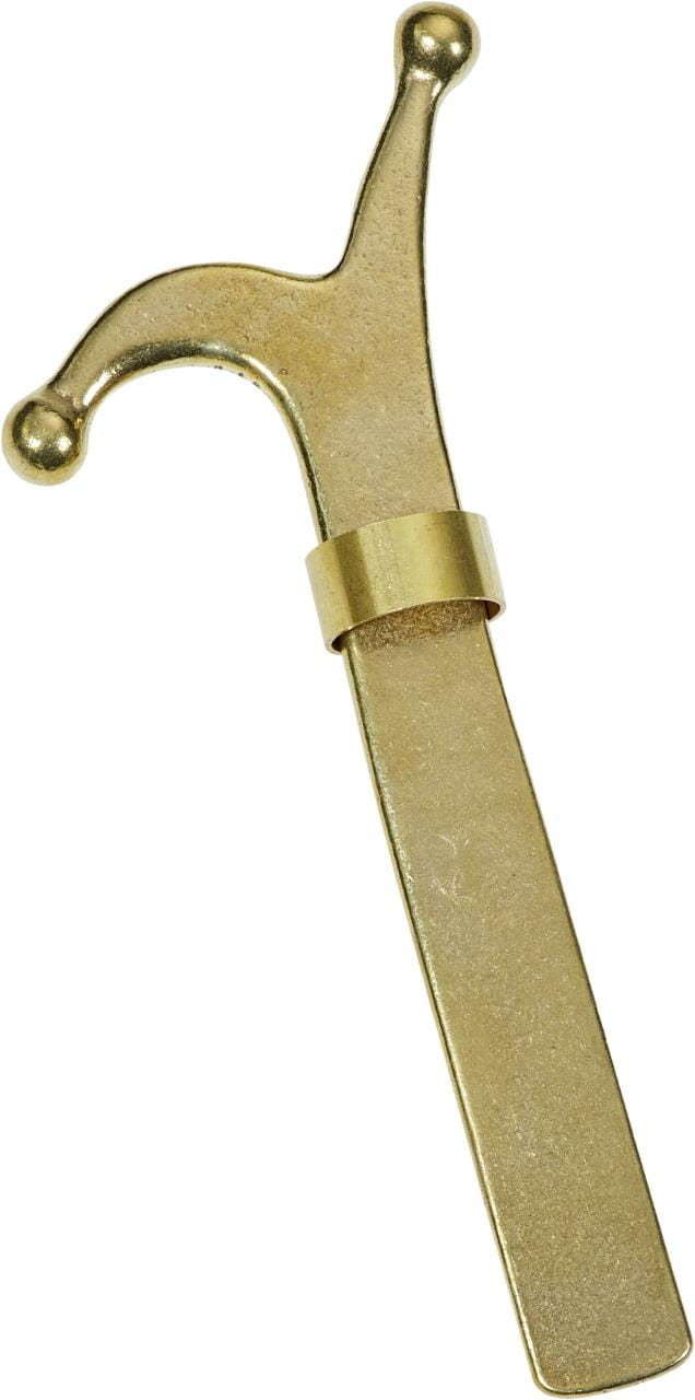 Bootshakenspitze aus Messingguss. Die schlanke Spitze mit zierlichen Knöpfen kann in einem geschlitzten Bootshakenstiel vernietet werden. Die Befestigungslasche hat keine Bohrungen, zwei Kupfernieten zum Befestigen werden mitgeliefert.