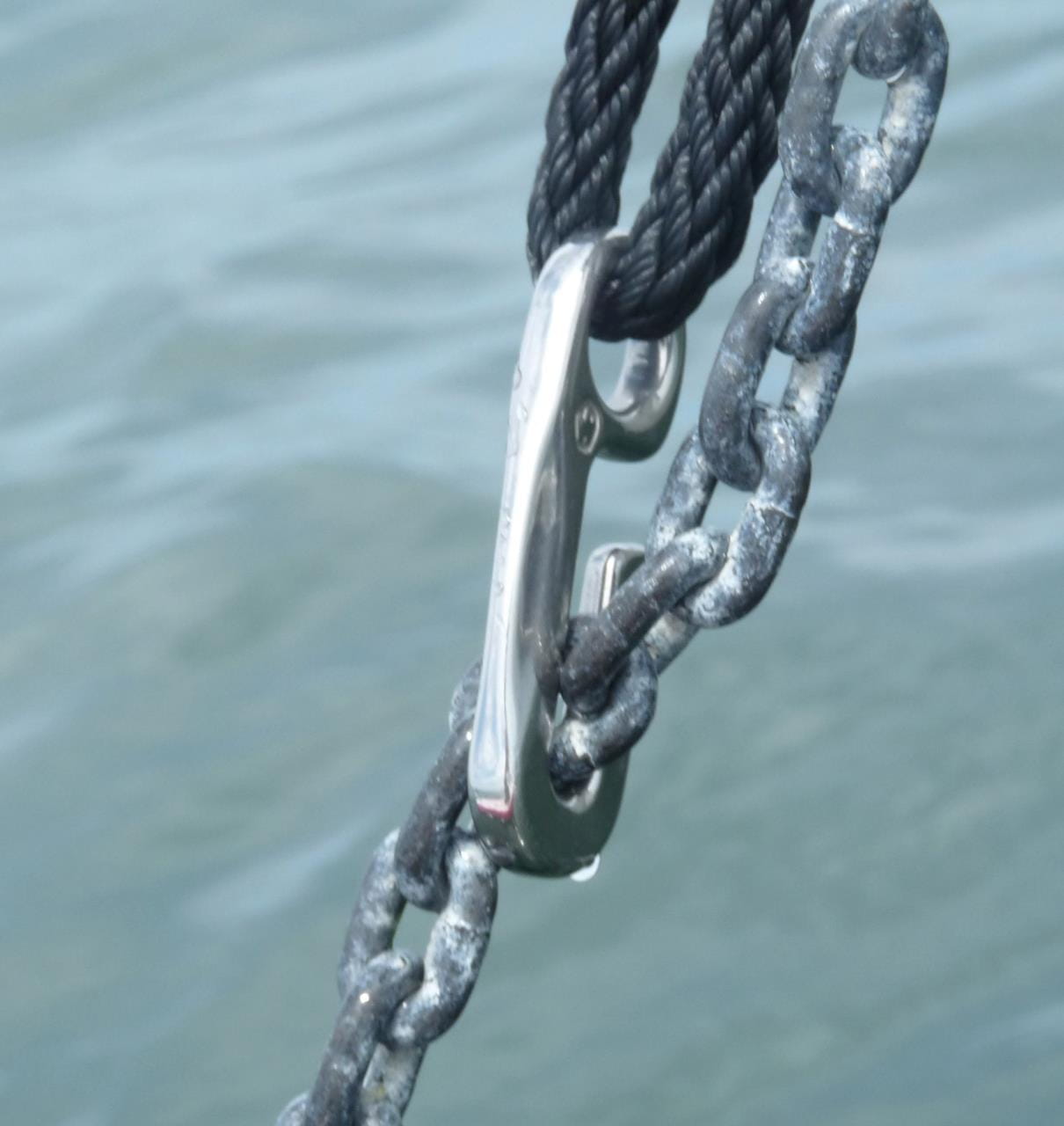 Geschmiedeter Haken aus V4A-Edelstahl, der sich problemlos und sicher in die Kette einhängen lässt. Der Kettenhaken entlastet die Ankerwinde und verhindert Kettengeräusche.