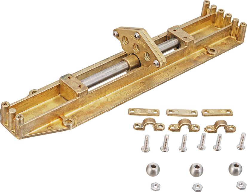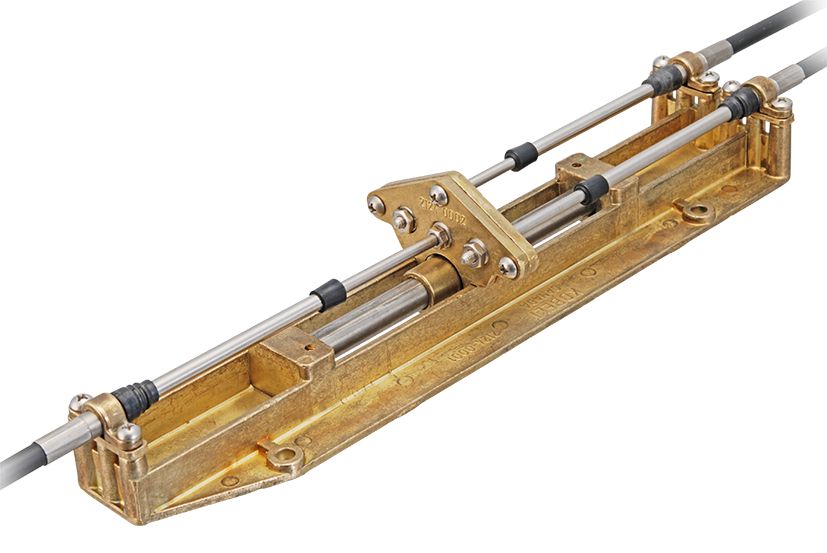 Diese robuste Einheit aus Gussbronze dient dazu, die Schaltzüge von zwei Motorsteuerungen auf einen Zug für die Maschinenbedienung zusammen zu führen oder zwei Maschinen mit einer Motorsteuerung zu bedienen.