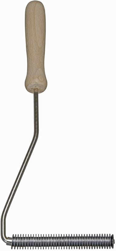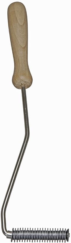 Kleine Scheibenroller aus Metall mit Holzgriff.