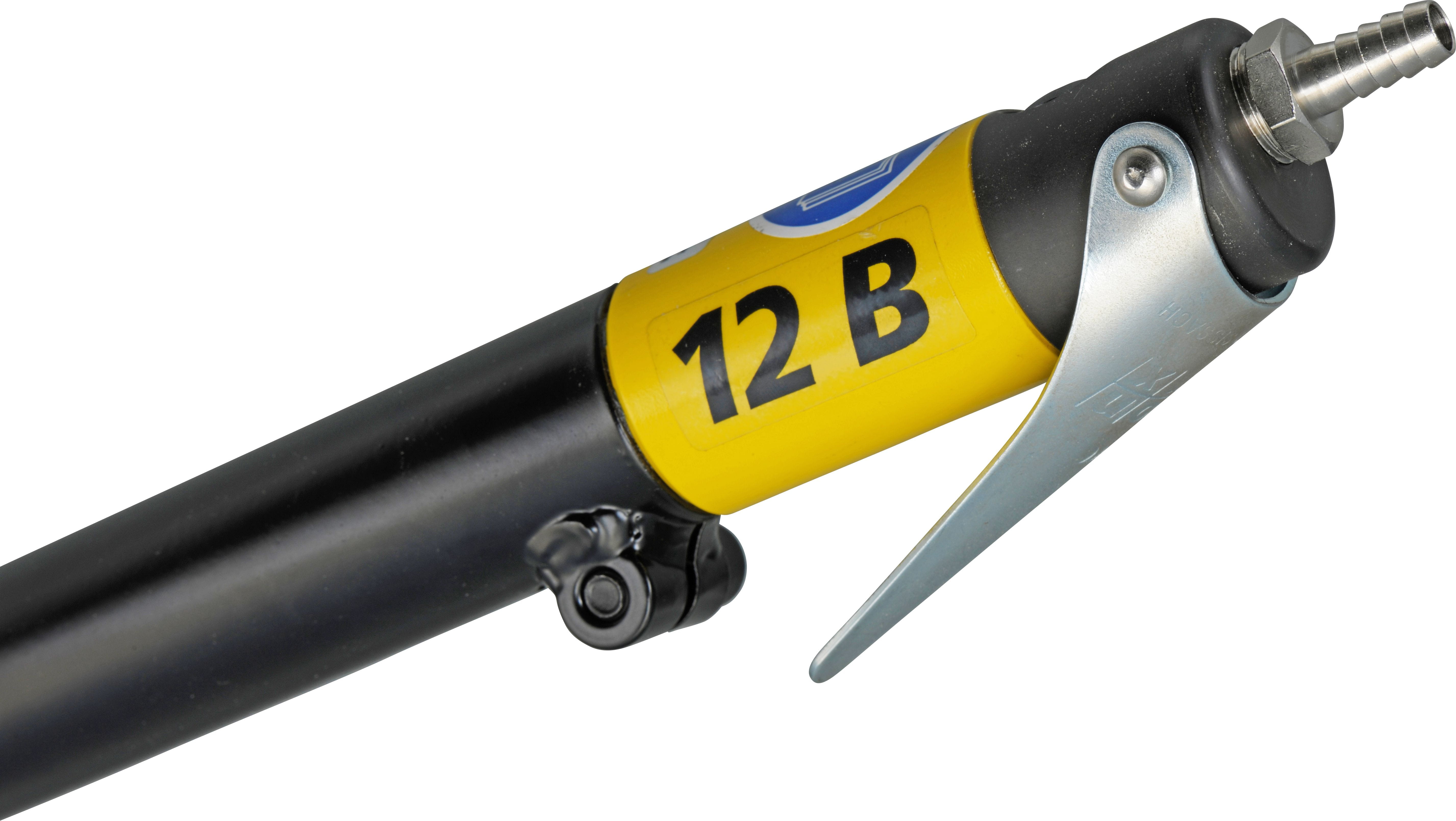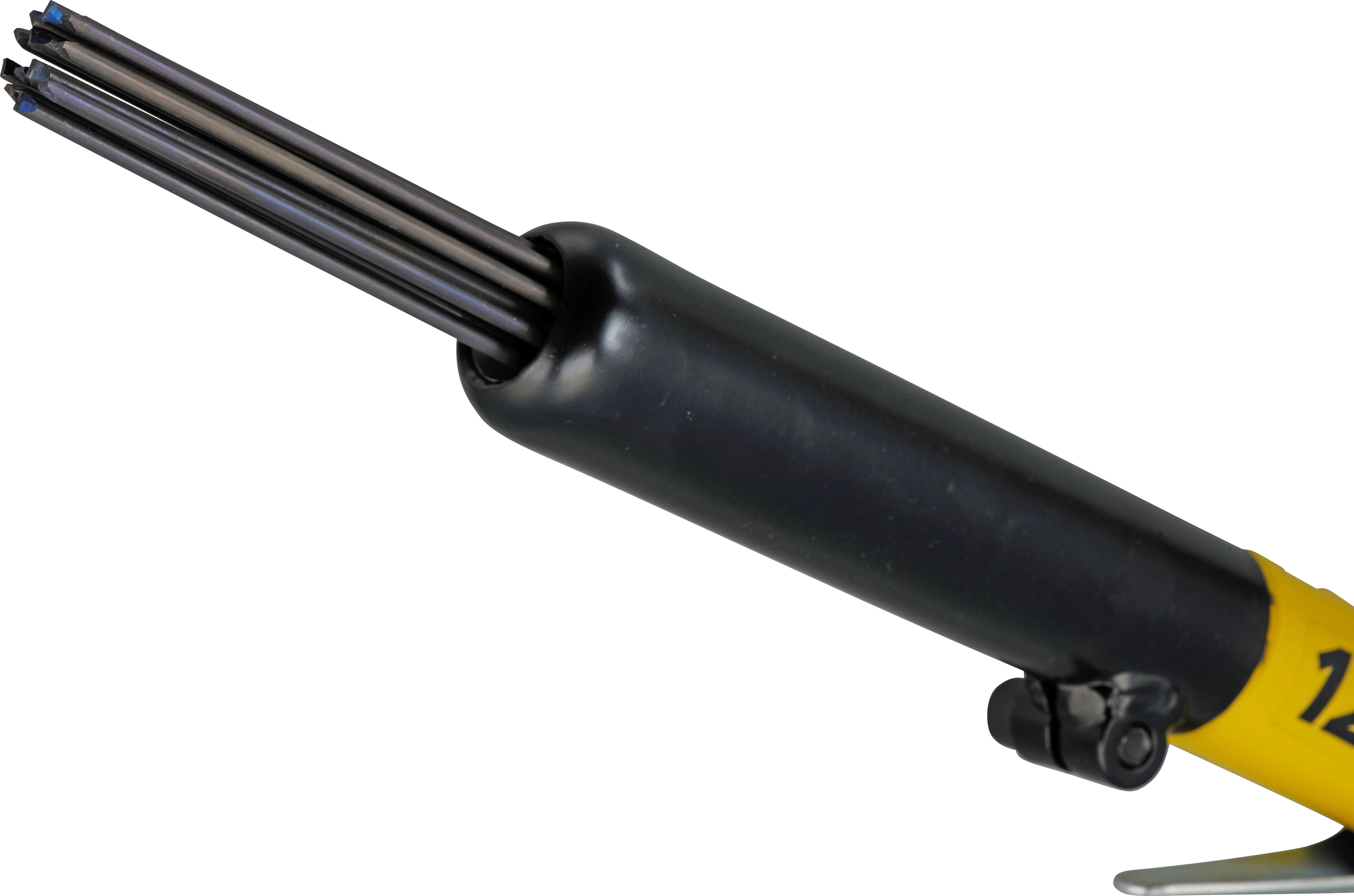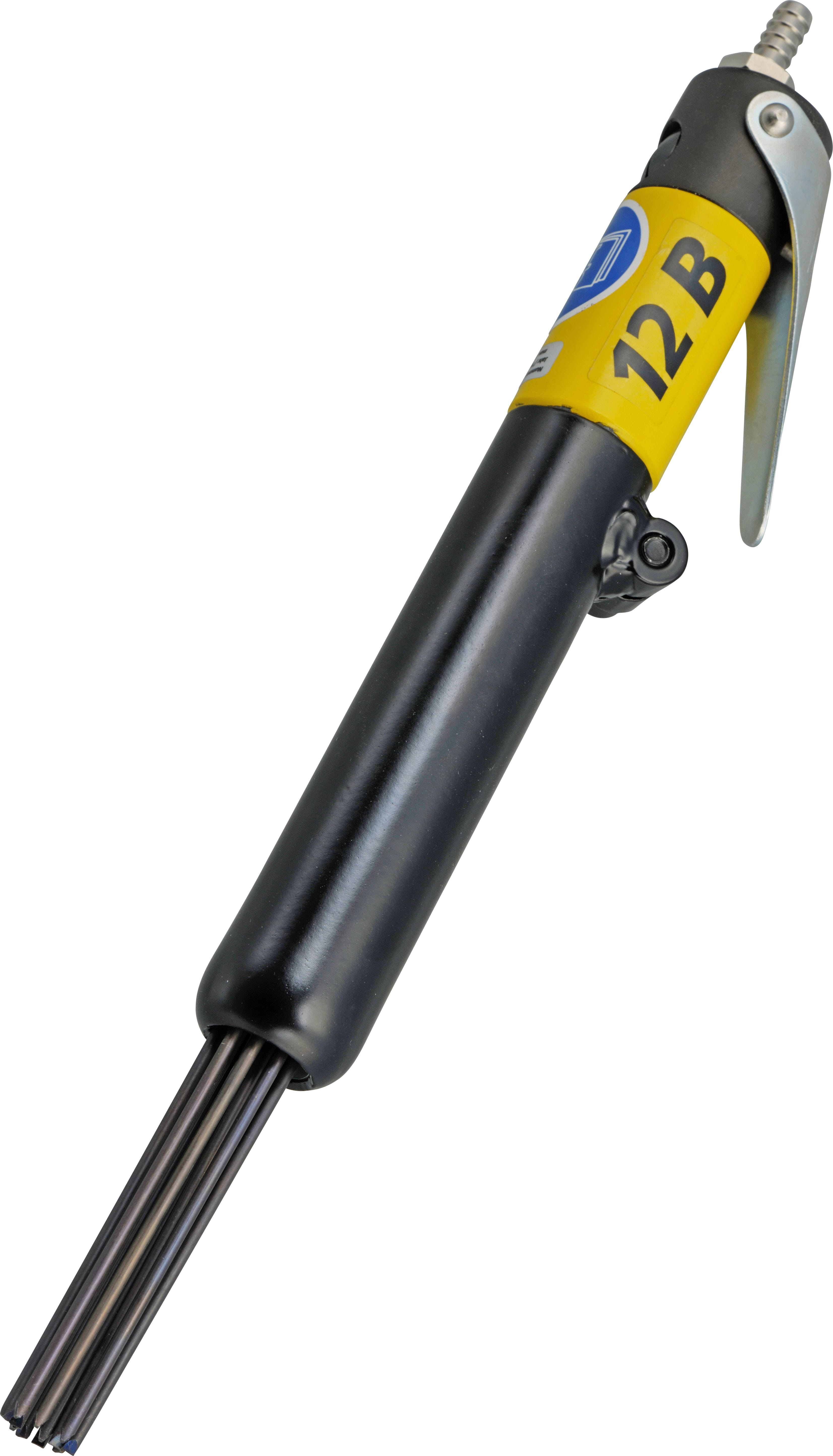 Druckluft-Nadelpistole des Herstellers VON ARX, ausgerüstet mit 12 Nadeln von je 3 mm Durchmesser. Professionelles, in der Schifffahrt und auf Werften auch Nagelhammer bzw. Nadelhammer genanntes Werkzeug zur effektiven Untergrundvorbereitung von Stahlkonstruktionen. Problemlos einsetzbar auch auf unebenen Flächen, Ecken, Kanten oder Schweißnähten. Das schnelle Aufschlagen der Nadeln lässt dicke Farbschichten, Rost oder Zunder abplatzen. Die schmale, handliche Konstruktion des Nadlers erlaubt zudem die Säuberung sonst schwer zugänglicher Stellen an Bord, zum Beispiel im Bereich der Bilge.
