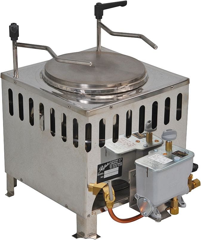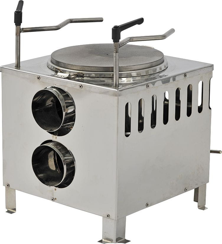 Ein kleiner Ölherd aus rostfreiem Edelstahl mit einer plangeschliffenen Kochplatte aus Gusseisen (D=188 mm).
