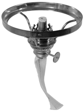 Der komplette Petroleumbrenner mit Reifen besteht aus Körbchen mit Reifen und Brandrohr mit Docht.