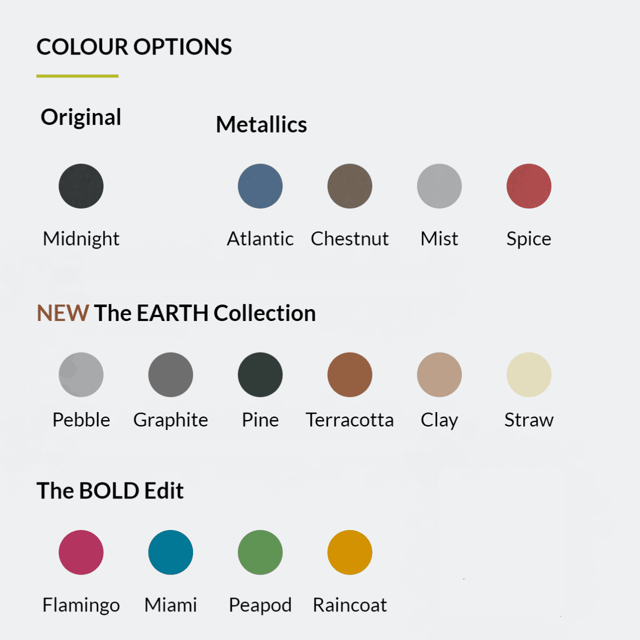 Neben der Standardfarbe Midnight (schwarz) werden 14 weitere Farben angeboten, die in 3 Gruppen unterteilt sind: