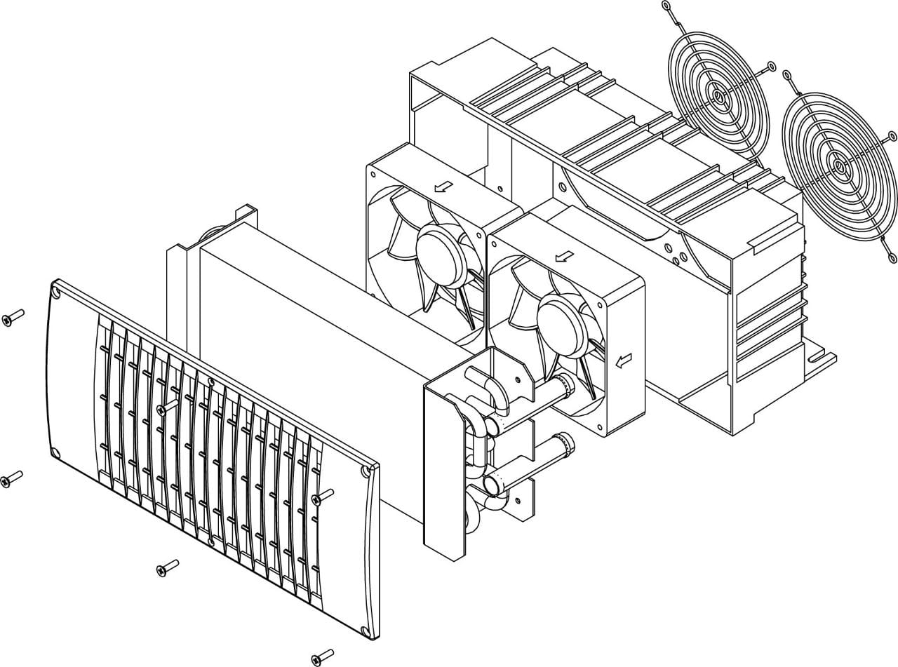Das Gerät verfügt über extrem leise Gebläsemotoren (48 dB) mit sehr geringer Stromaufnahme und über einen effektiven Aluminium- Radiator.