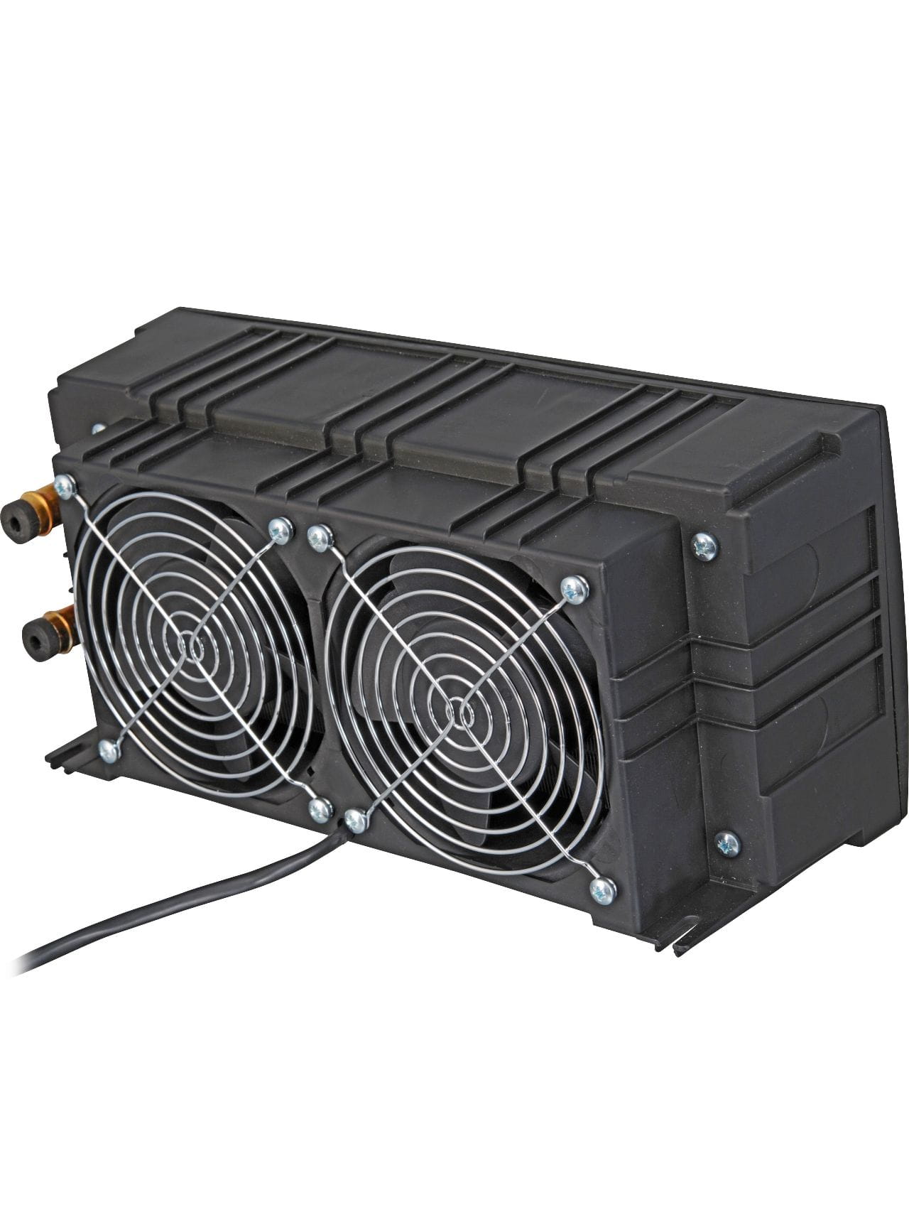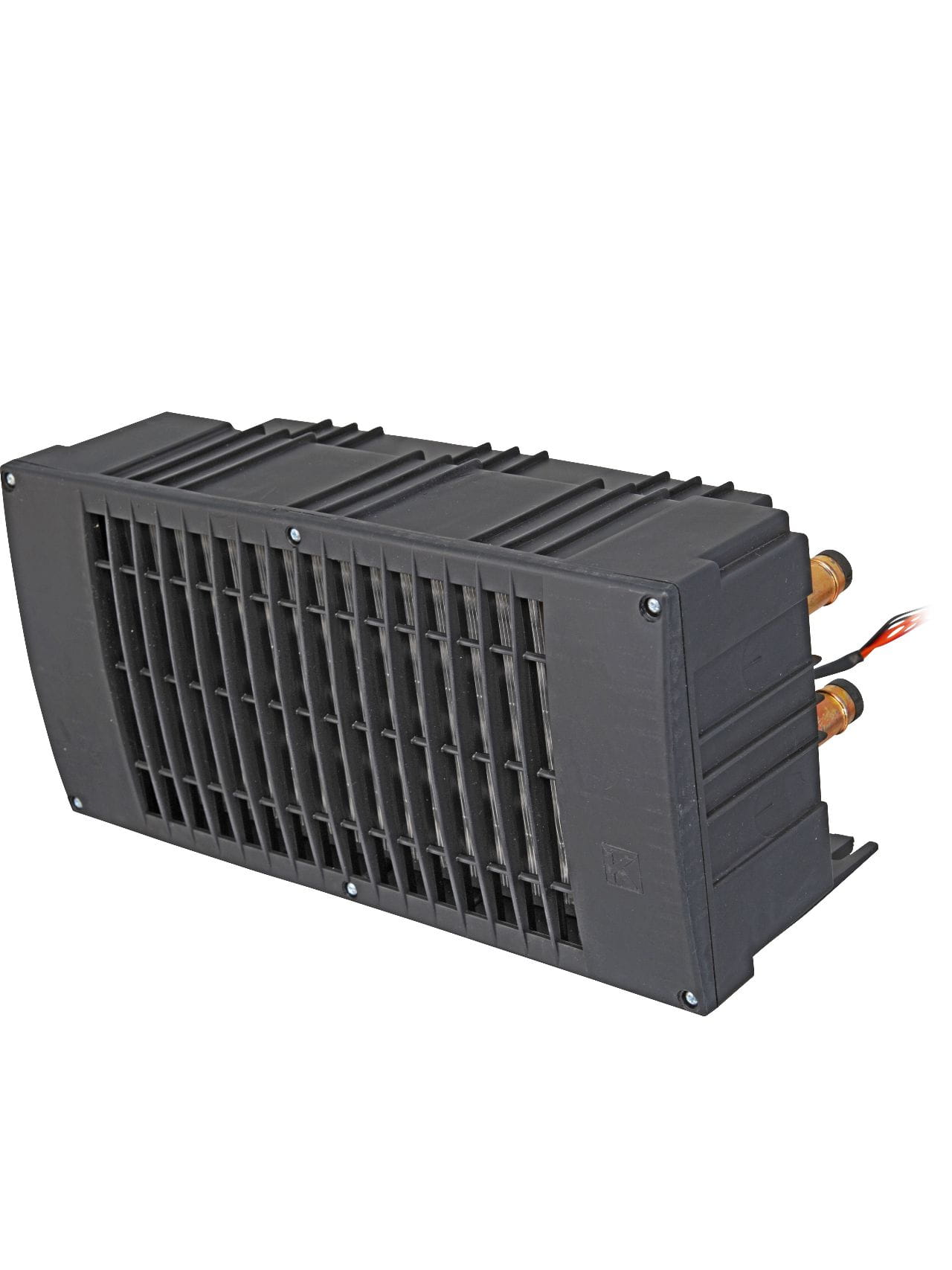 Wasser-Luft-Wärmetauscher mit zwei Lüftern, der an den Warmwasserkreislauf einer Bordheizung oder den Kühlwasserkreislauf der Maschine angeschlossen werden kann und die Kajüte mit Warmluft heizt.