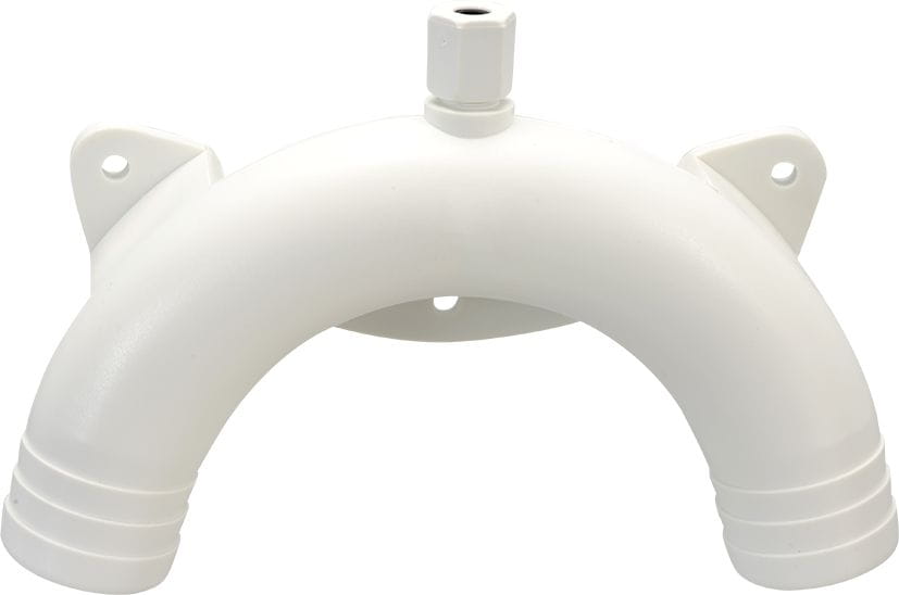 Rohrbogen 160° aus bruchsicherem ABS-Kunststoff, mit verschraubtem Schnüffelventil und Befestigungsfüßen für Schottmontage.