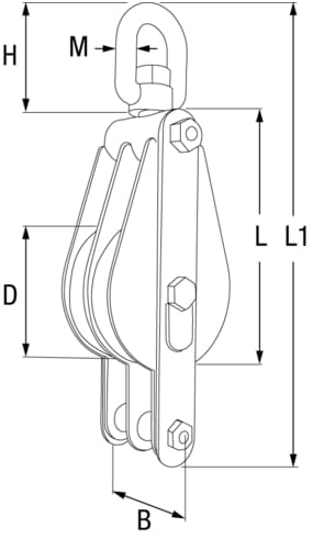 Schwere Metallblöcke aus Edelstahl (AISI 316) mit hohen Bruchlasten. Alle Blöcke sind einseitig mit Wirbelauge und einseitig mit fester Hundsfott versehen. Die Scheiben sind aus seewasserbeständigem Tufnol mit Gleitlagerbuchsen aus Messing.