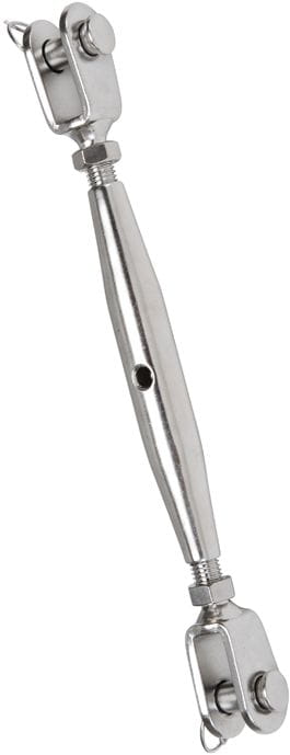 Metrisches Gewinde, geschlossene Hülse mit Kontermuttern, beidseitig geschweißte Gabel mit Splintbolzen.