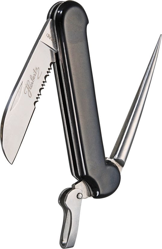 Der Marlspieker ist feststellbar, die Klinge ist im letzten Drittel mit Sägeverzahnung versehen.
