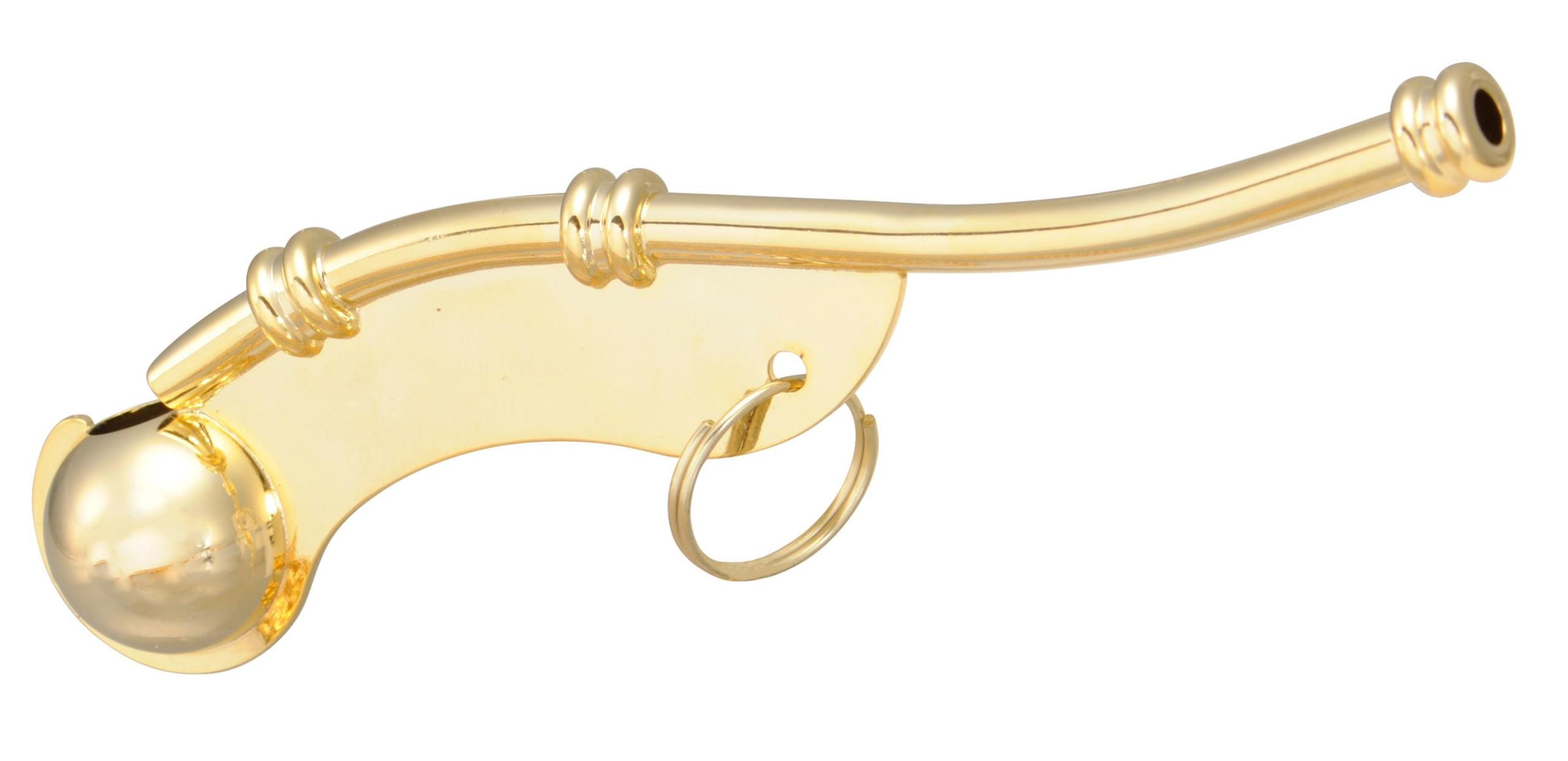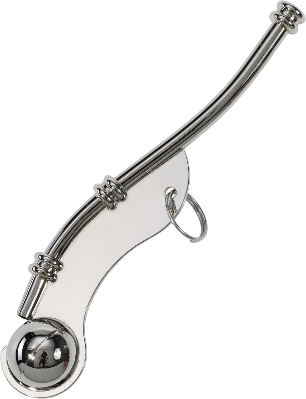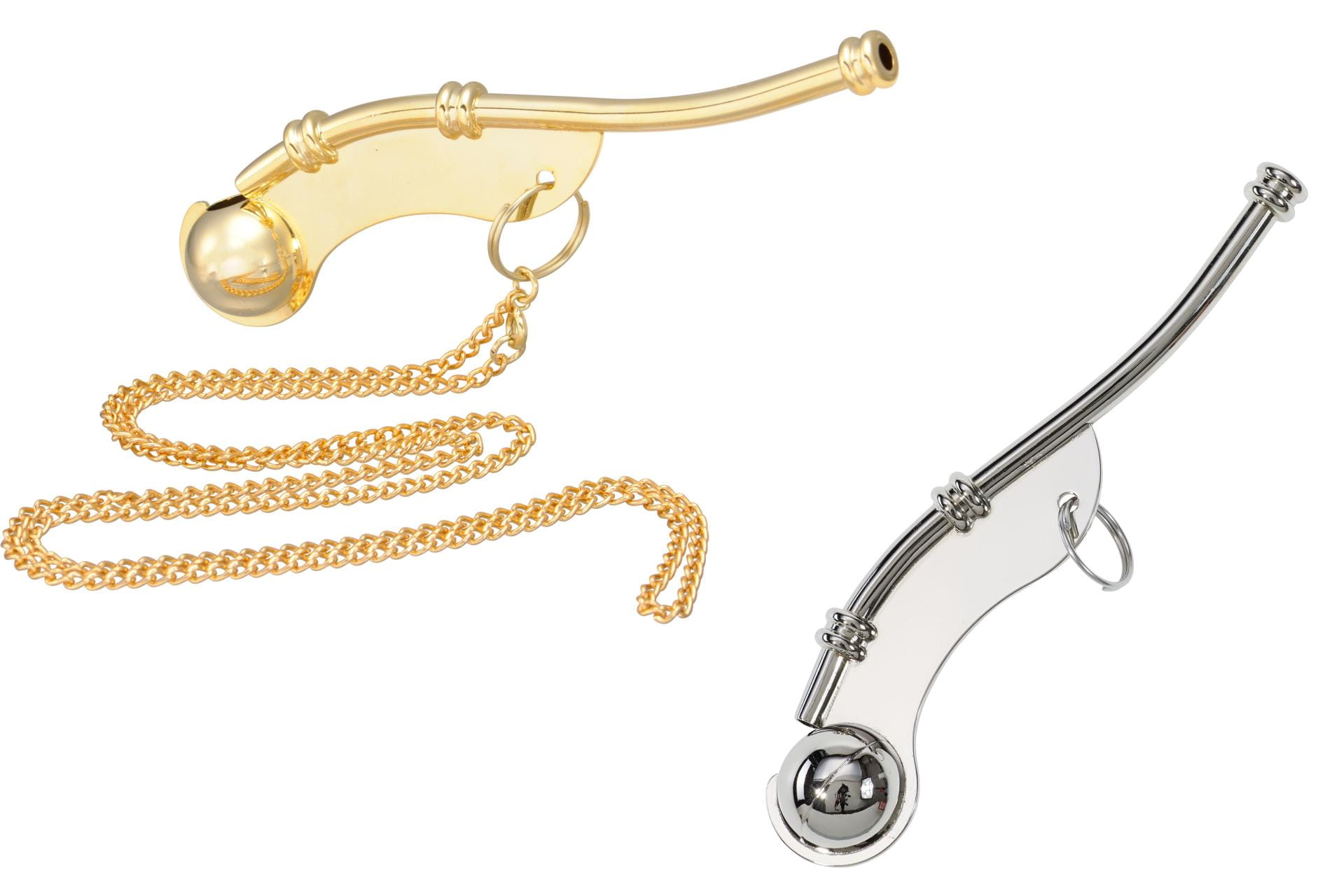 Lieferung der Messing-Pfeife inklusive Kette. Die vernickelte Variante wird ohne Kette geliefert.