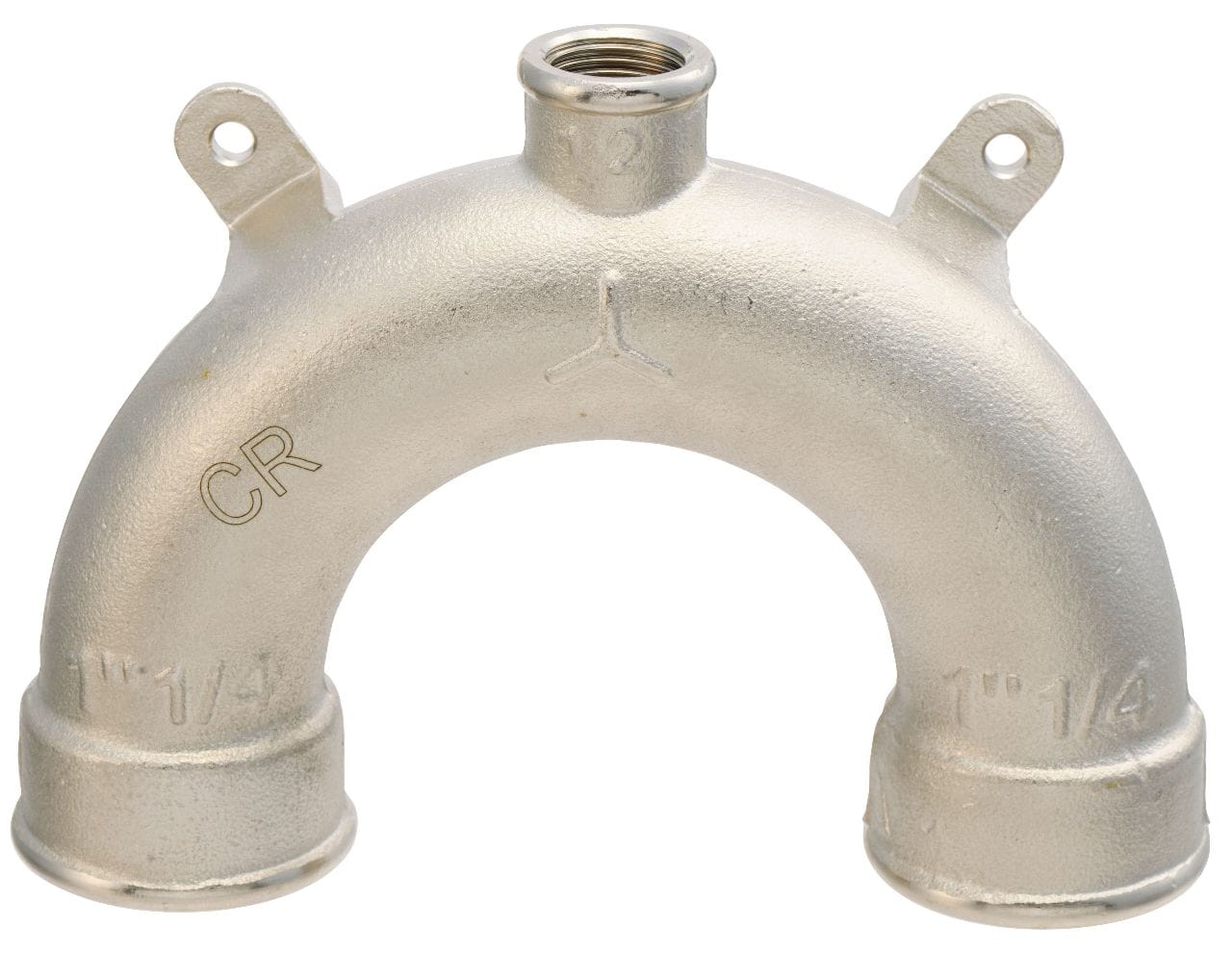 Solider Schwanenhals-Rohrbogen aus vernickeltem CR-Messing (CW602N). Der Schwanenhals hat BSP-Innengewinde zum Leitungsanschluss und gebohrte Laschen zur Befestigung. Alle Varianten tragen an der Bogenoberseite einen ½"-BSP-Innengewindeanschluss zur Aufnahme eines entsprechenden Schnüffelventils, das als Zubehör bestellt werden kann.