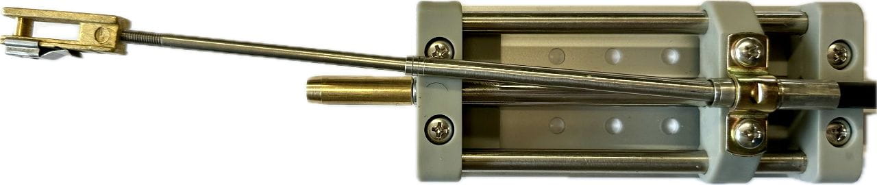 2. Der Gleitschlitten des Verbinders muss zuerst ausgebaut werden, dafür die Kunstoff endkappen abschrauben. Der erste Zug wird dann in das mittlere Rohr geschoben und am bis zum Anschlag angeschraubt, im Rohr ist ein Gewinde. Auf das herausragende Gewinde wird nun die Messing-Verlängerung geschraubt.