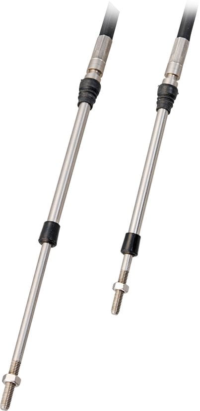 Hochwertiges, leichtgängiges Markenschaltkabel für Druck (max. 35 kg) und Zugkraftübertragung (max. 70 kg) zwischen Schalthebel und Maschinenanlage.