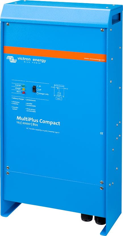 VICTRON ENERGY-Geräte sind auf Grundlage modernster Hybrid-Hochfrequenztechnologie für den professionellen Einsatz entwickelt. Die Basis des MULTIPLUS bildet ein leistungsfähiger Sinus-Wechselrichter, verbunden mit einem Batterielader und einem Automatikumschalter, alles kombiniert in einem kompakten blauen Metallgehäuse: