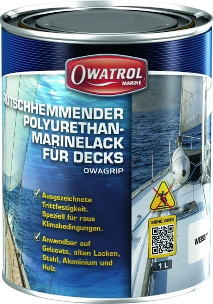 Die Beschichtung wirkt zweifach rutschhemmend durch das enthaltene Granulat sowie die raue Strukturierung beim Auftrocknen. OWAGRIP wurde speziell für die extremen Witterungsbedingungen im maritimen Bereich entwickelt, ist abriebfest, UV-resistent und antikorrosiv. Kann auf bereits bestehende Farbsysteme auf Basis von Polyurethan, Epoxid, Alkyd und Acrylbasis aufgetragen werden.