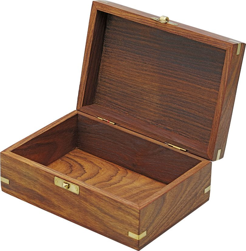 Die Holzkiste ist mit Messingbeschlägen verziert.