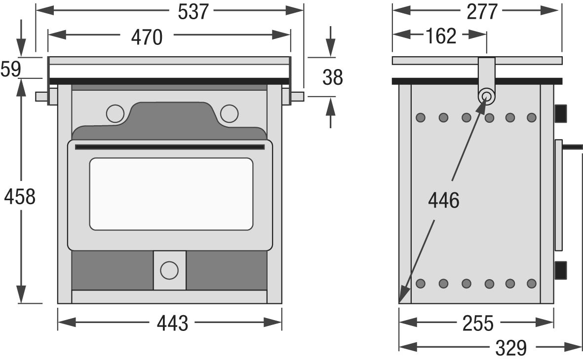 - Kochfeld: zwei emaillierte Gusseisenplatten, einzeln abnehmbar