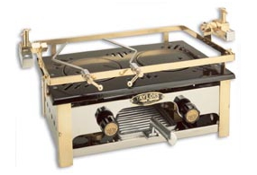 Gehäuse aus rostfreiem Stahl, Herdplatte und herausnehmbare Brennerabdeckung emailliert, Schlingerleiste und Beschläge aus Messing.