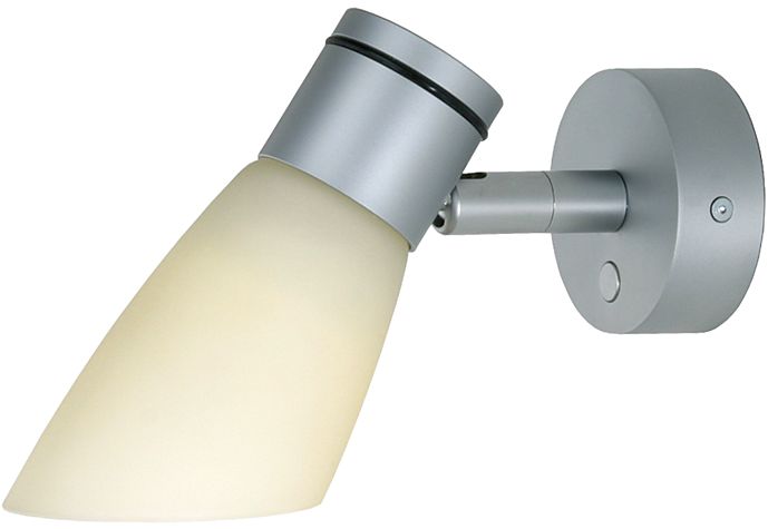 Traditionelle Wandleuchte mit verchromtem oder goldfarbenem Lampenkopf und satiniertem, schrägen Glasschirm. Lieferbar in drei Ausführungen: mit oder ohne USB-Steckdose oder mit dim2warm-Technologie.