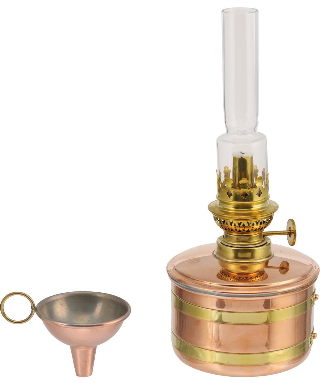 Die Leuchte ist handpoliert, das harmonische Zusammenspiel der beiden Materialien Kupfer und Messing lässt das warme Licht der Petroleumflamme angenehm strahlen. Die Petroleumlampe ist mit einem KOSMOS Brenner ausgestattet.