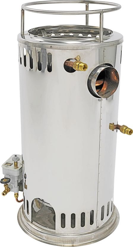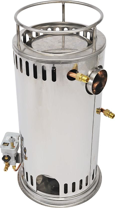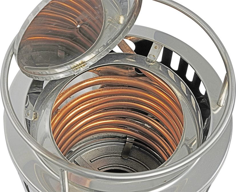 Zentralölofen mit kupferner Heizschlange zum Anschluss von Heizkörpern und einem Warmwasserbereiter. Lieferung mit Schlingerrand.
