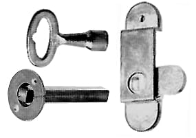 Das komplette Set besteht aus Anschraubbeschlag mit Schließzunge, Vierkant-Schließstab mit runder Rosette und Vierkant-Steckschlüssel.