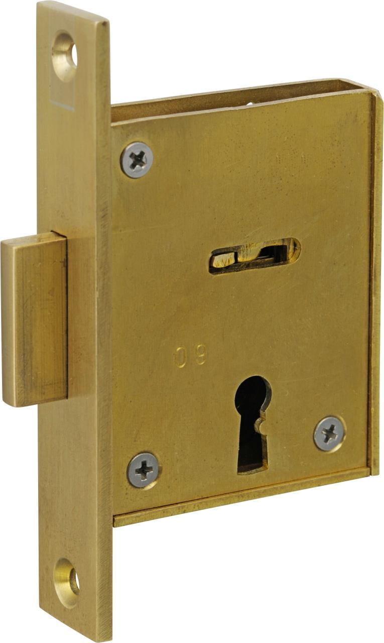 Möbelschloss aus Messing mit 4 Zuhaltungen, rechts oder links verwendbar. Das Schloss ist wahlweise lieferbar mit einem Stulp aus geschliffenem Messing oder aus verchromtem Messing.