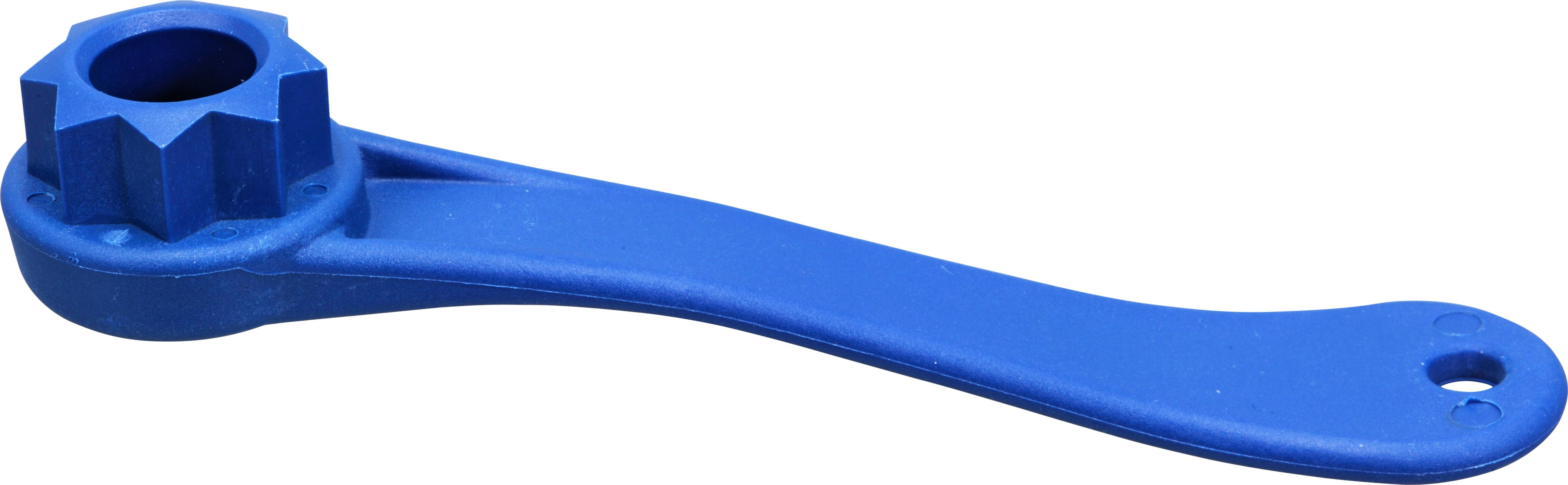 Schlüssel zum öffnen von Deckseinfüllstutzen und Tankverschluss aus blauem Kunststoff.
