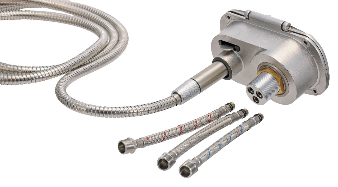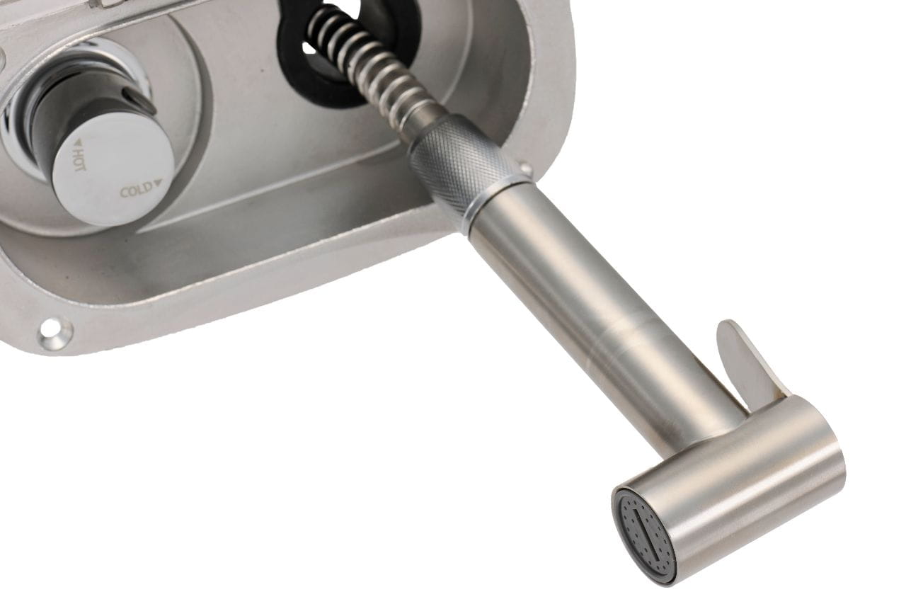 Duscharmatureinheit in solider Ausführung für den senkrechten Schott- oder Wandeinbau im Decks- oder Cockpitbereich. Das Gehäuse aus Edelstahl AISI 316 ist mit einem überkragenden, polierten Klappdeckel ausgestattet. Dieser ist selbsttragend und bleibt in geöffneter Position selbstständig offen stehen. Die Handbrause mit Auslösehebel sowie die Kalt-/Warm-Armatur mit zylindrischem Einhebelmischer sind ebenfalls aus seewasserbeständigem Edelstahl hergestellt. Die Wassermenge wird durch Kippen des Hebels nach unten reguliert, die Temperatur durch seitliches Drehen eingestellt. Die Armatur verfügt über zwei Zuläufe für Kalt- und Warmwasser sowie einen separaten Mischwasserabgang zur Handbrause. Lieferung inklusive 2,5 m ausziehbarem Duschschlauch und Anschlussschläuchen. Die Einbautiefe des Gehäuses beträgt 71 mm, zuzüglich Platzbedarf für die rückseitig eingeschraubten Anschlussschläuche. Die Montage des Gehäuses erfolgt über einen verdeckten Befestigungskranz mit vier Senkbohrungen.
