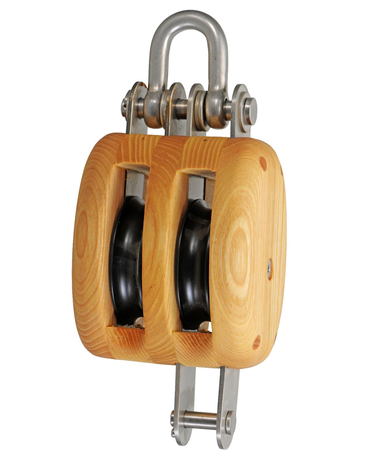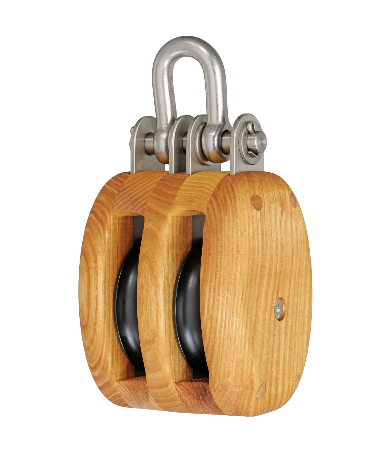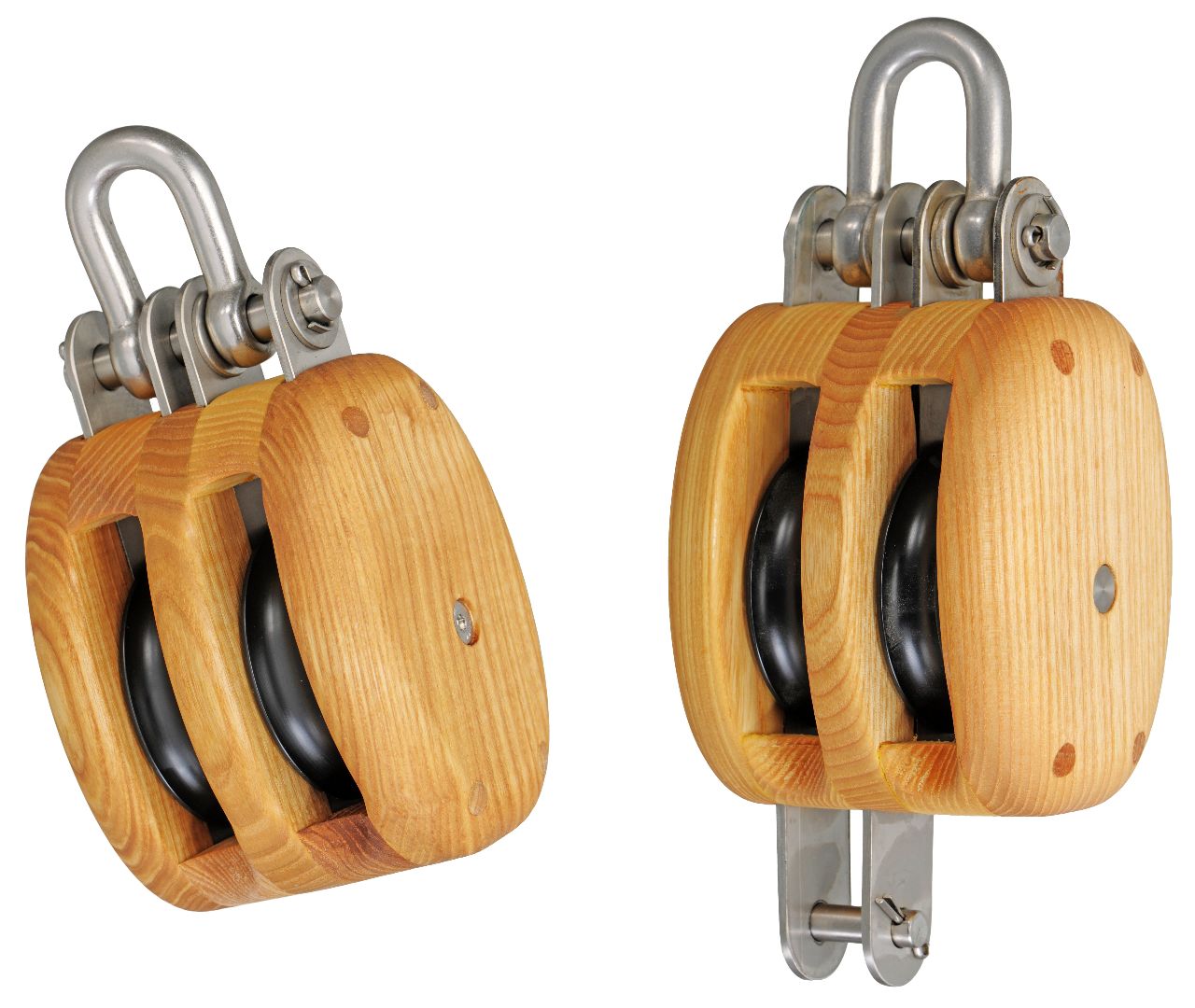Robuste, 2-scheibige traditionelle Taljenblöcke aus Eschenholz in klassischer Form und Bauweise. Die Beschläge aus langlebigem Edelstahl (AISI316), deren Oberfläche matt gebeizt ist und so den Eindruck von Arbeitsblöcken mit feuerverzinkten Beschlägen vermittelt.