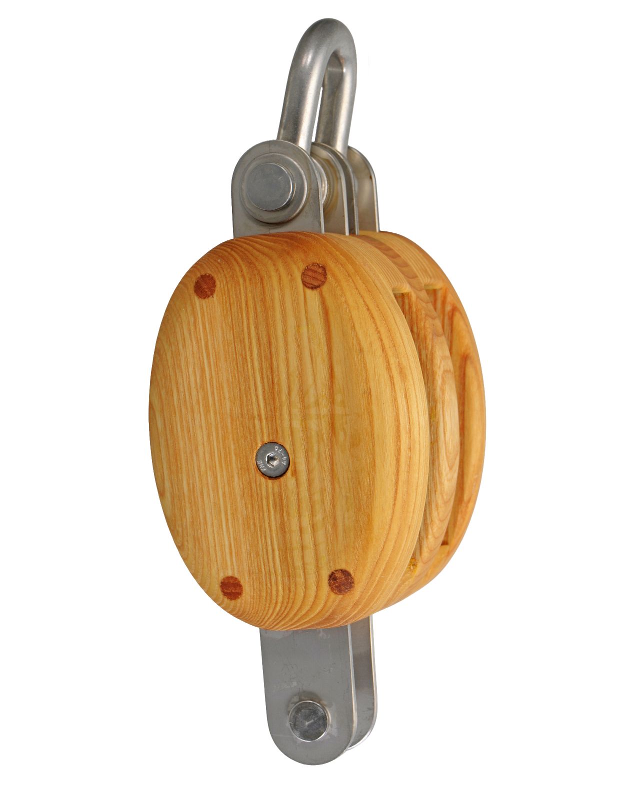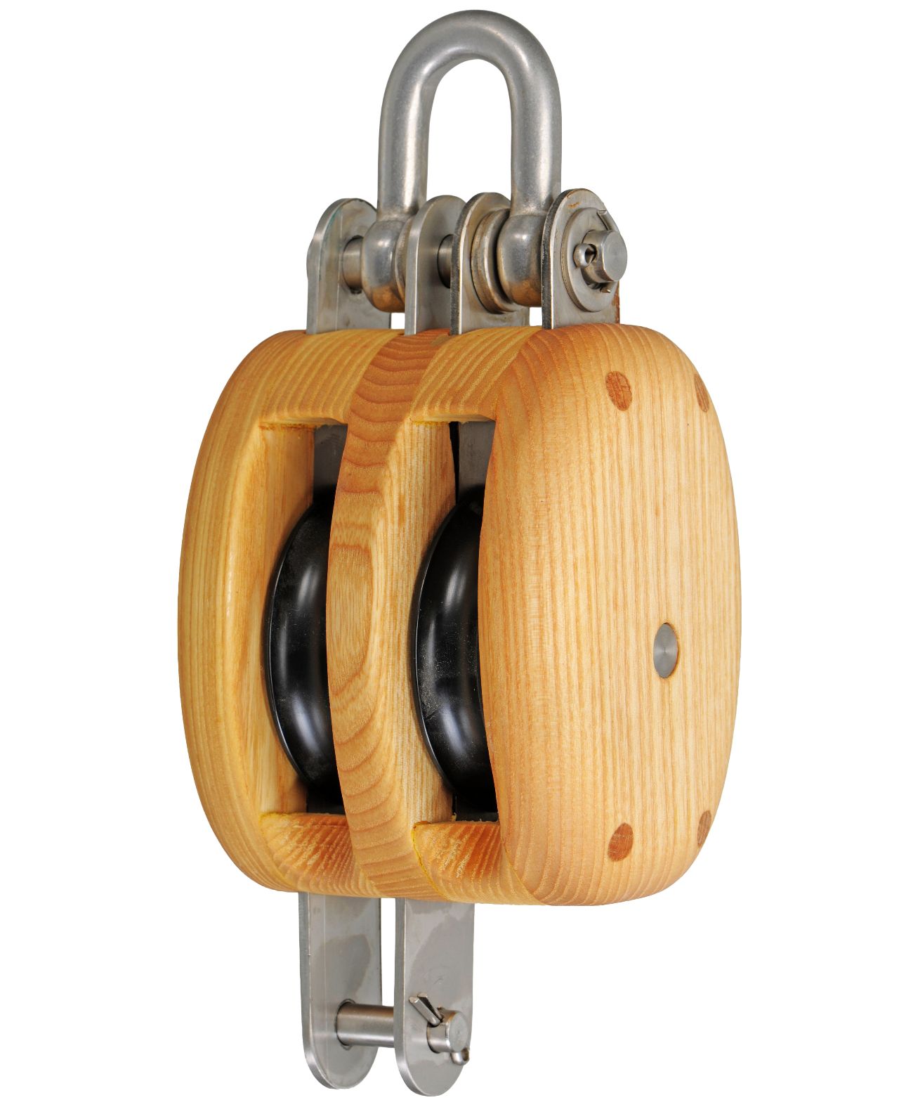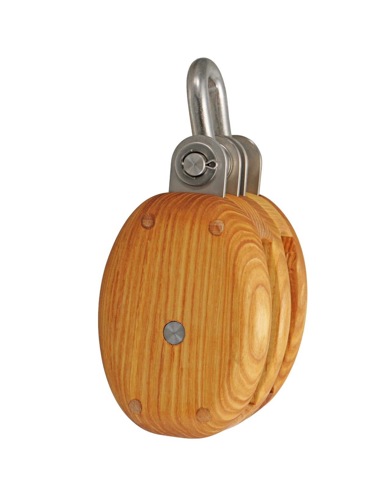 Robuste, 2-scheibige traditionelle Taljenblöcke aus Eschenholz in klassischer Form und Bauweise. Die Beschläge aus langlebigem Edelstahl (AISI316), deren Oberfläche matt gebeizt ist und so den Eindruck von Arbeitsblöcken mit feuerverzinkten Beschlägen vermittelt.