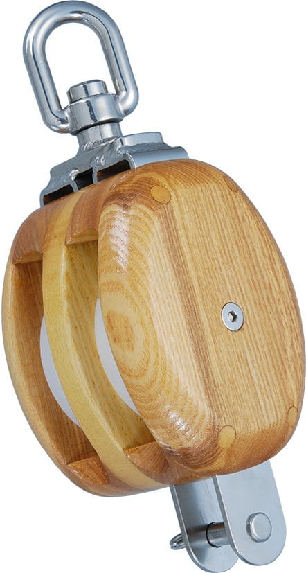 Beschläge aus poliertem Edelstahl. Seilscheibe aus weißem Polyamid (auf Wunsch aus Tufnol möglich).