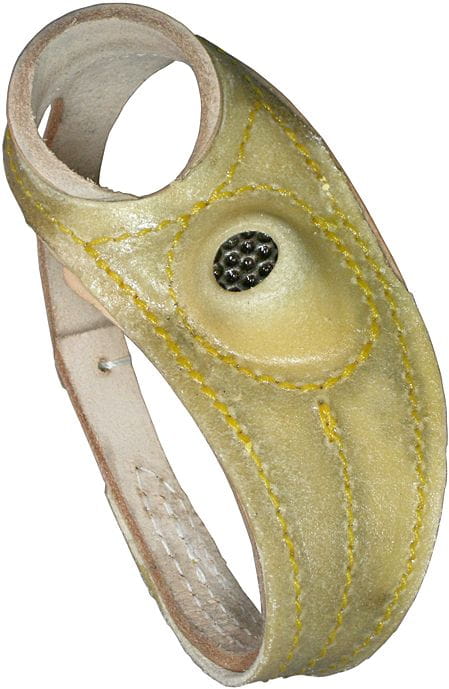 Aus Leder gefertigt, mit kräftiger Lederverstärkung um die zierliche Stichplatte.