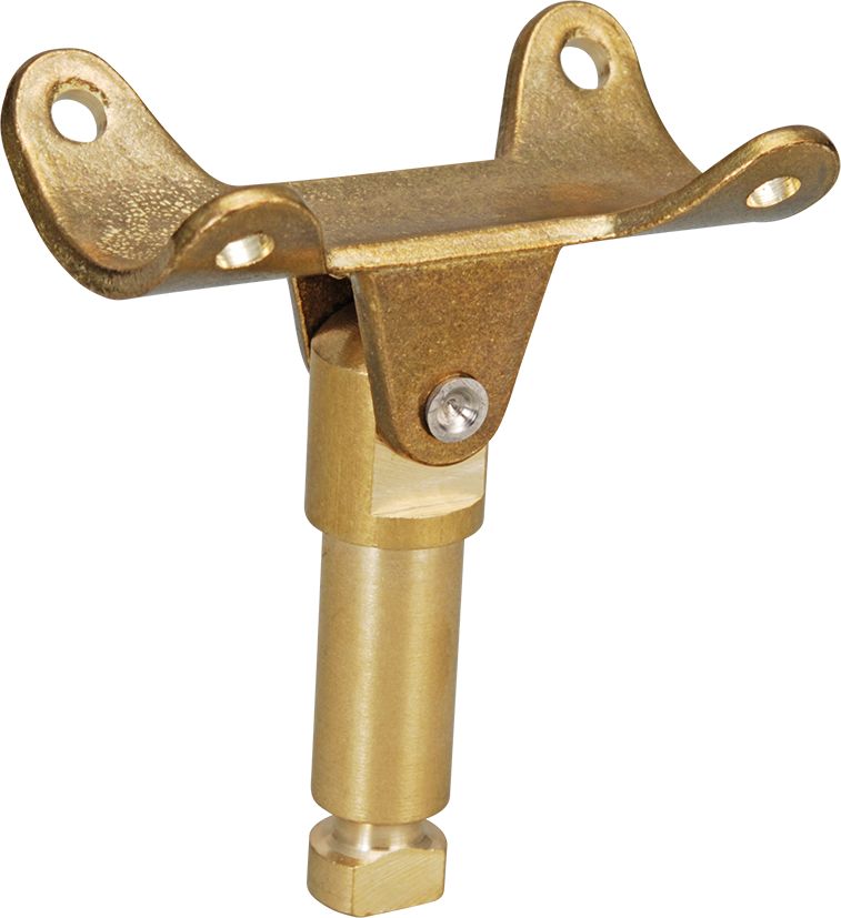Ruderhalterung aus Messing für Schlauchboote. Die Riemen werden an der gerundeten Grundplatte befestigt und mit dem Schaft in die Tülle am Schlauchboot gesteckt, eine Führungsnut am unteren Schaftende verhindert das Herausrutschen aus der Tülle.
