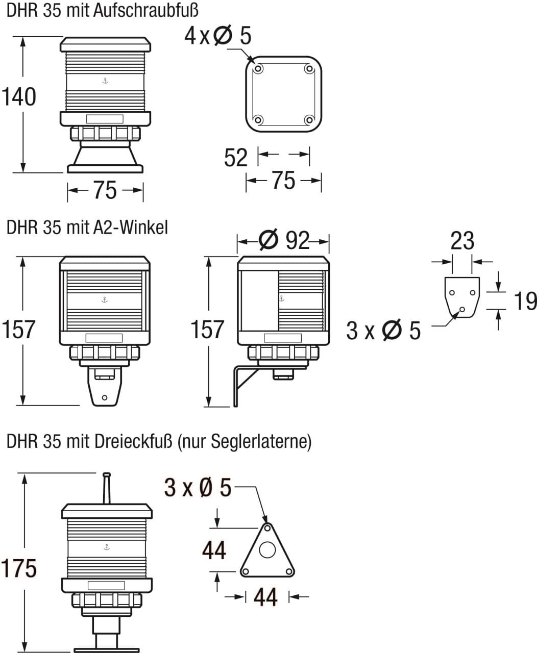 Die Seitenlichter werden standardgemäß mit einem A2-Winkel für die Seitenmontage geliefert, die Segler- und Topplaterne haben einen Anschraubfuß. Es ist aber möglich, mit einem separat bestellbaren Montagefuß die Lampen individuell umzubauen.