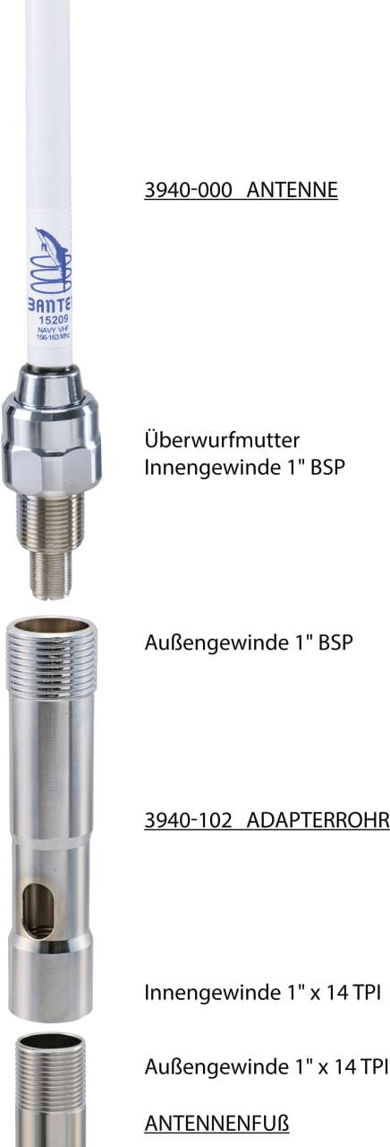 - einseitig passendes 1" BSP-Außengewinde für die Überwurfmutter der CX-Antenne,