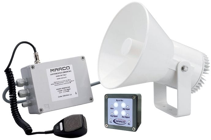 Elektronische Schallsignalanlage mit Druckkammer-Lautsprecher und Mikrofon für Durchsagen. Die Anlage hat eine Zulassung für Schiffe bis 20 m als Signalanlage und Nebelhorn, gemäß COLREG 1972, IMO Class III, zugelassen von BSH, RINA, Lloyd's Register, MCA, BureauVeritas.